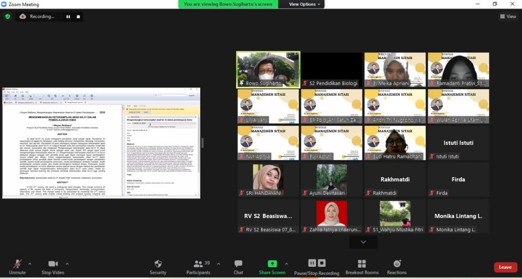 Program Studi S2 Pendidikan FKIP UNS Surakarta mengadakan acara Webinar Manajemen Sitasi pada Selasa, 5 Oktober 2021. Acara ini juga menjadi batu pertama pencanangan Program Keilmiahan Mahasiswa yang akan rutin dilaksanakan setiap satu bulan sekali. Acara berjalan baik dengan dihadiri oleh 44 partisipan dari S1 dan S2 Pendidikan Biologi dengan menghadirkan narasumber yang kompeten dalam bidang penelitian pendidikan yaitu Dr. Bowo Sugiharto yang juga merupakan Kepala Program Studi S2Pendidikan Biologi, FKIP UNS.
