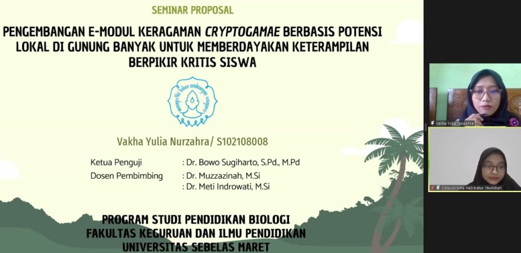 Program Studi Magister Pendidikan Biologi Fakultas Keguruan dan Ilmu Pendidikan Universitas Sebelas Maret (UNS) menyelenggarakan ujian seminar proposal penelitian tesis yang diadakan melalui platform Zoom. Seminar ini menampilkan Vakha Yulia Nurzahra, mahasiswi Magister Pendidikan Biologi, dengan judul penelitian “Pengembangan E-Modul Keragaman Cryptogamae Berbasis Potensi Lokal di Gunung Banyak untuk Memberdayakan Keterampilan Berpikir Kritis Siswa.” Acara ini dihadiri oleh tim penguji yang terdiri dari Dr. Bowo Sugiharto, Dr. Muzzazinah, dan Dr. Meti Indrowati.