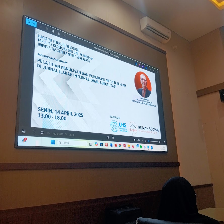 Surakarta, 14 April 2025 — Program Studi Magister Pendidikan Biologi FKIP Universitas Sebelas Maret (UNS) menyelenggarakan Pelatihan Penulisan dan Publikasi Artikel Ilmiah di Jurnal Internasional Bereputasi pada hari Senin, 14 April 2025. Kegiatan ini berlangsung di Ruang Sidang Lantai 3, Gedung F FKIP UNS, dan diikuti antusias oleh mahasiswa serta dosen Program Studi S2 Pendidikan Biologi.