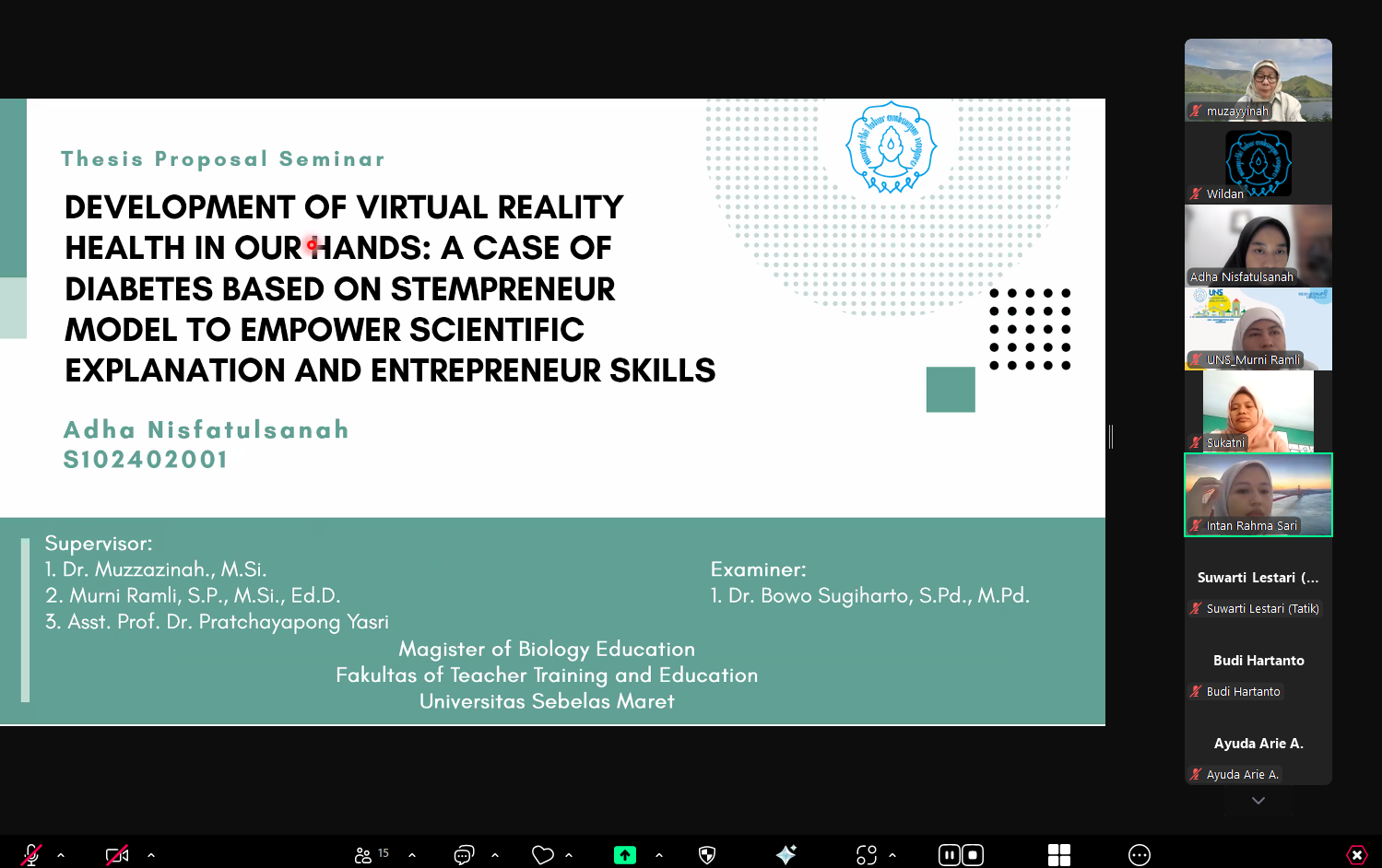Surakarta, May 7th, 2025– A new educational initiative aims to enhance scientific explanation and entrepreneurial skills among students through the innovative use of virtual reality (VR) technology. This development is part of a thesis proposal seminar titled ‘Development of Virtual Reality Health in Our Hands: A Case of Diabetes Based on STEMpreneur Model’ by Adha Nisfatulsanah, a graduate student at the Master of Biology Education program at Universitas Sebelas Maret.